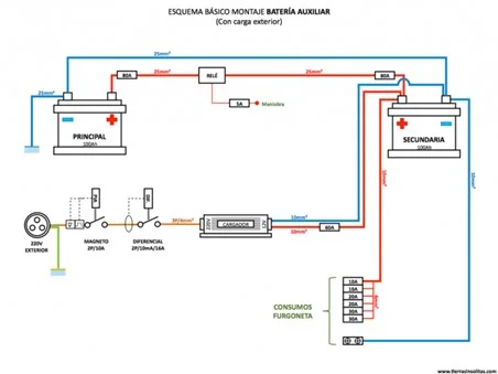 - Instalación de 12V. Se deberá homologar cuando al menos uno de sus elementos esté anclado al vehículo, por lo que no es necesario certificado eléctrico. En la salida de la batería deberá haber fusibles para proteger las salidas hacia los distintos aparatos. Los elementos que no son propios del vehículo, tales como frigorífico o el inversor, deberán llevar contraseña de homologación. En el caso de conectar la segunda batería a la principal para que se recargue con el alternador del coche se deberá instalar sistemas de separación e instalar fusibles de protección.